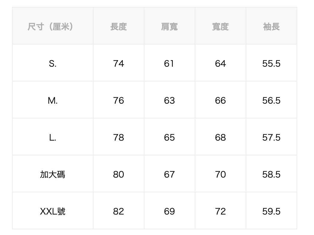 S 肩寬61 胸寬64 袖長55.5 衣長74 CM